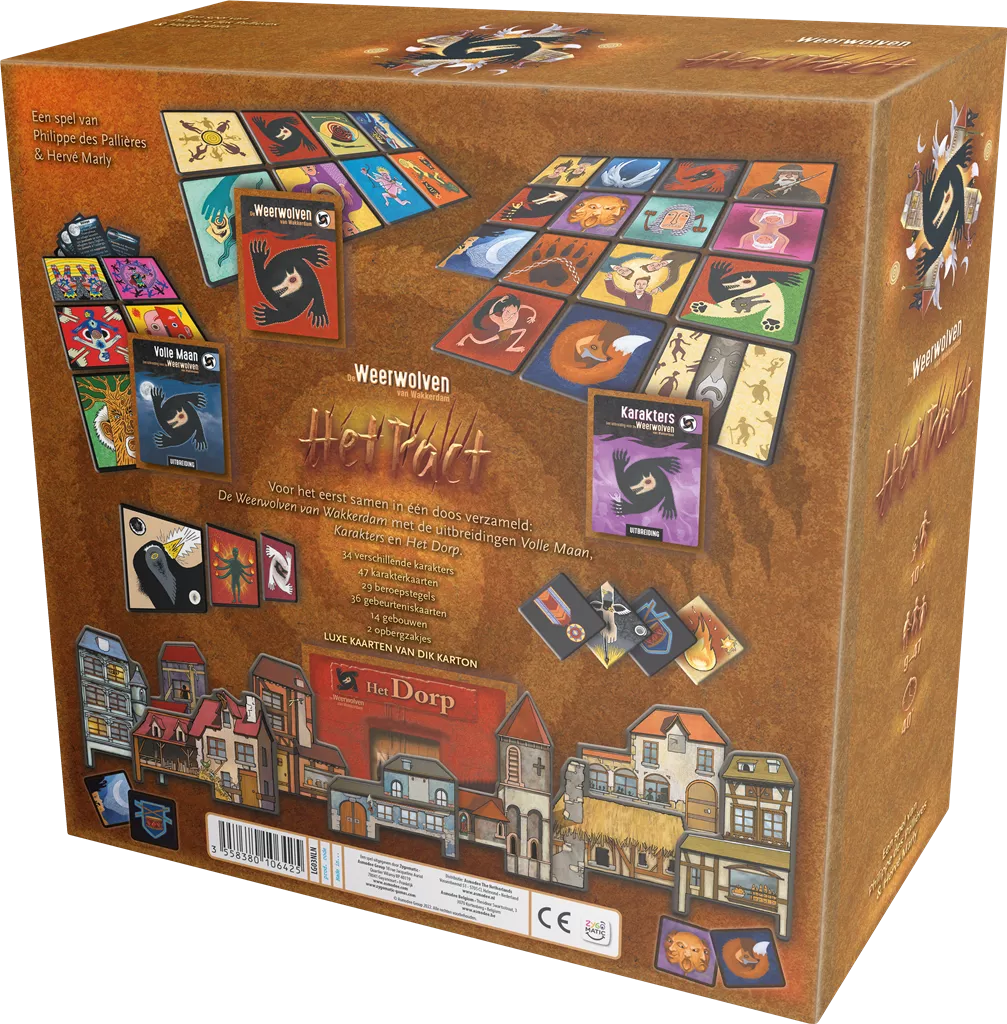Het Pact is een bundeling van het Weerwolven van Wakkerdam basisspel en de drie uitbreidingen Volle Maan, Karakters en Het Dorp. Let op: de gebouwen uit Het Dorp zijn luxe kaarten van dik karton. Deze grote verzamelbox is ideaal als cadeau tijdens de feestdagen.