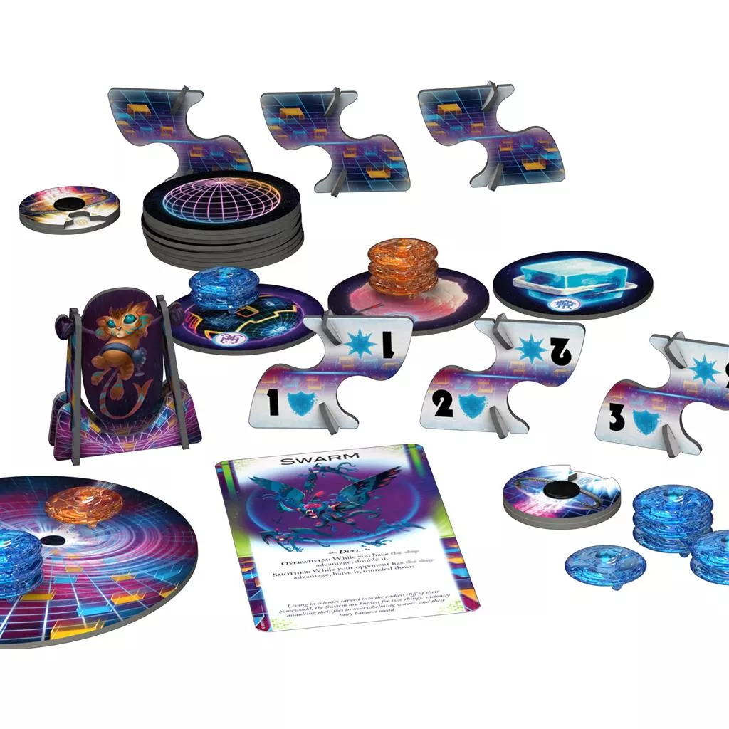 In addition to your unique species and its ability, you have twenty spaceships to traverse the cosmos and maintain control over the five planets you need to become a Certified Civilization. As long as you have a ship on a planet, you have control of it, even if your opponent also has ships there and you must share control. You can deploy these ships to fight in duels, use them to act as reinforcements, or draw them back for a tactful retreat. Just don’t lose them to the Warp or let them be claimed by the black void between the stars and end up lost in space forever!