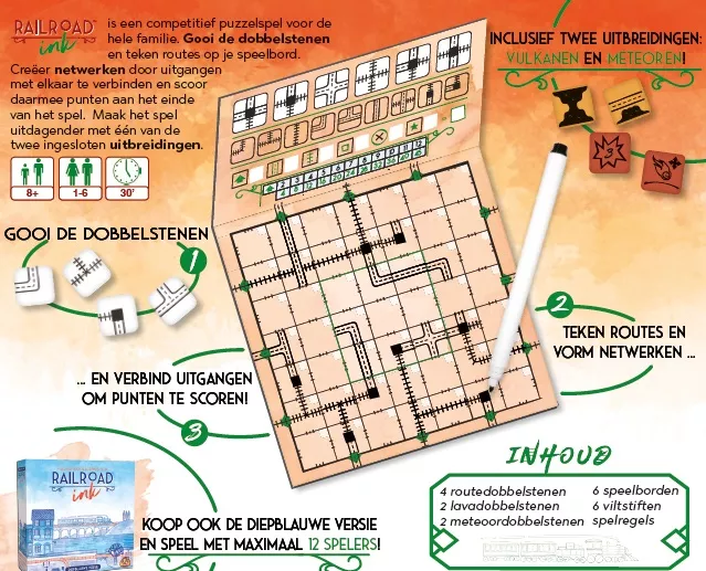 Railroad Ink is een competitief puzzelspel voor de hele familie. Gooi de dobbelstenen en teken routes op je speelbord. Creëer netwerken door uitgangen met elkaar te verbinden en scoor daarmee punten aan het einde van het spel. Maak het spel uitdagender met één van de twee ingesloten uitbreidingen.Gooi de dobbelstenenTeken routes en vorm netwerkenVerbind uitgangen om punten te scorenInclusief 2 uitbreidingen: Vulkanen en Meteoren